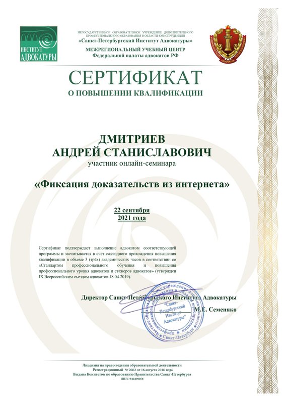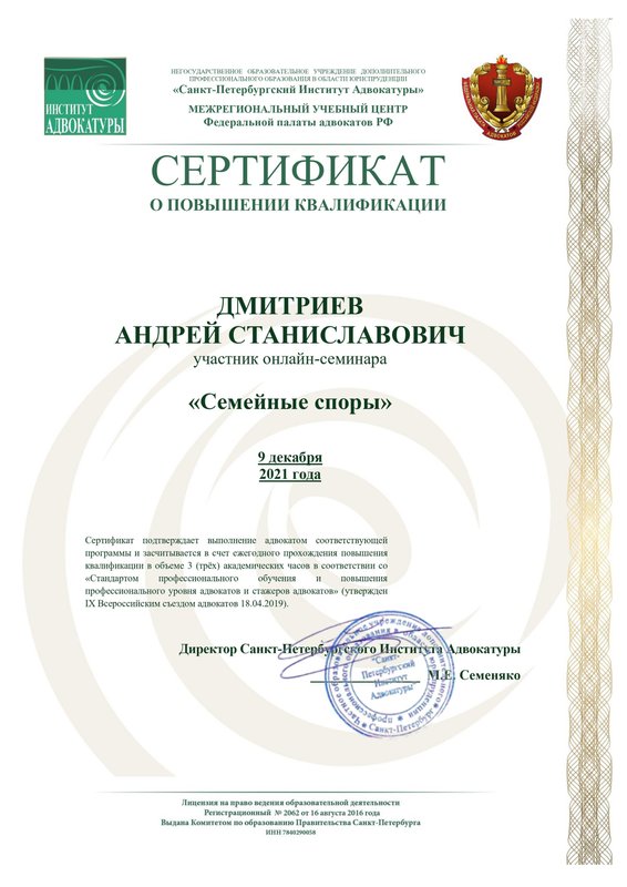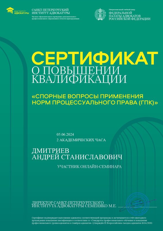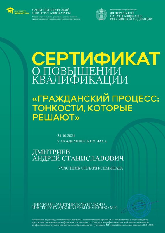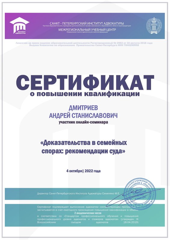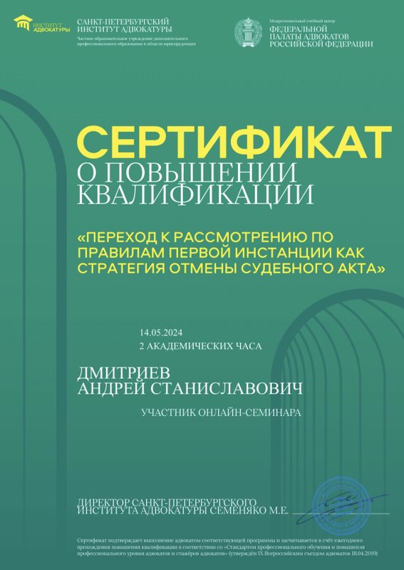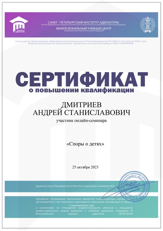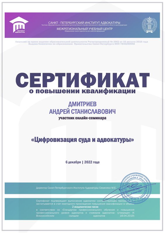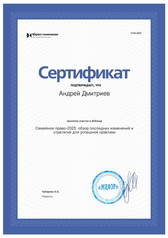 Преимущества: Часто обращаюсь к Андрею Дмитриеву за юридической консультацией, по вопросам семейного права. Всегда получаю четкий, конкретный и понятный ответ! А главное, получаю рекомендации, которые я смело могу использовать!
