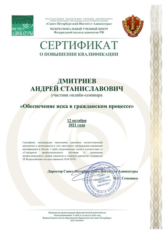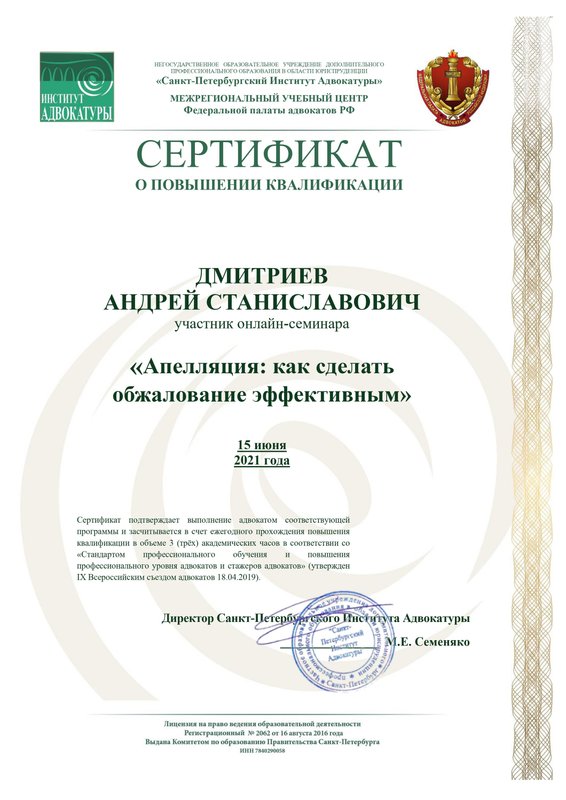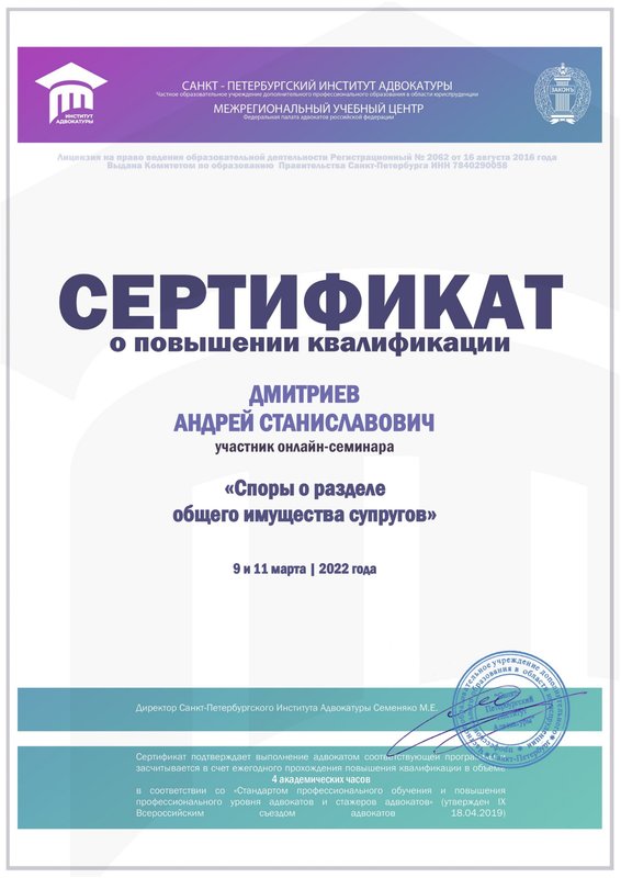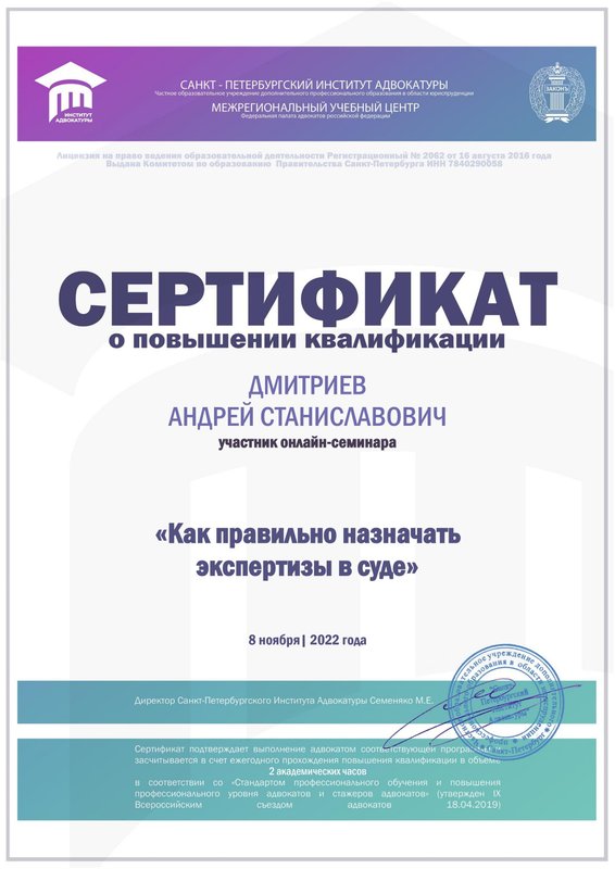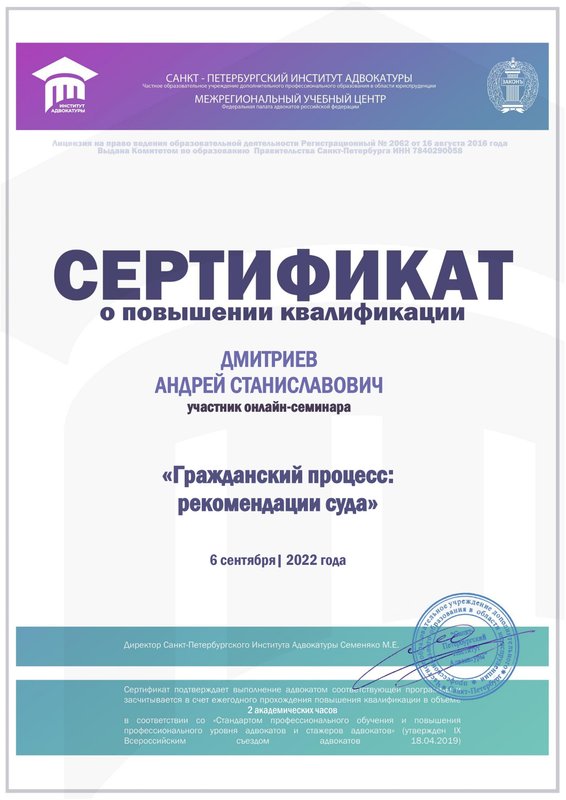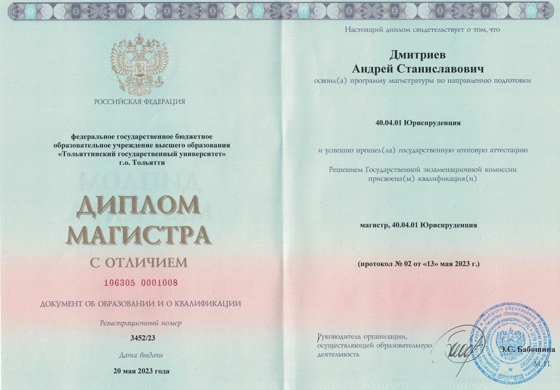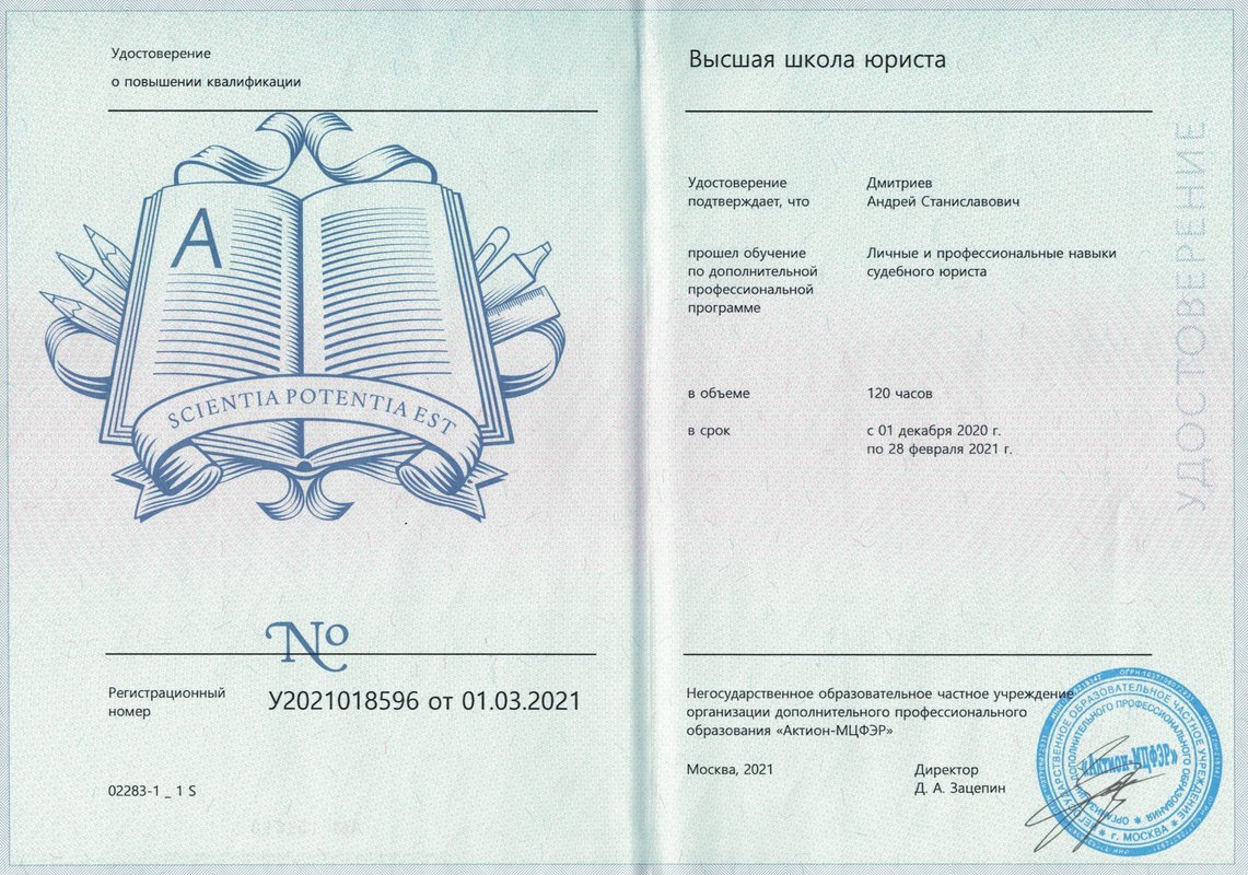 Магистр права диплом с отличием (серия 106305 номер 0001008). Опыт работы во всех районных судах Санкт-Петербурга, частично в судах Москвы и Ленинградской области.