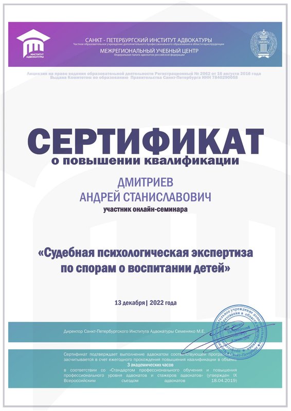 Семейный юрист Андрей Дмитриев - специалист высочайшей квалификации! Когда я оказался в практически безвыходной ситуации и мне не давали общаться с сыном, я обратился к нему из другого города. Я получил грамотную консультацию по всем вопросам, были составлены все необходимые документы, Андрей очень грамотно вёл себя на судебных заседаниях, в итого суд мы выиграли, был составлен нормальный порядок общения с ребенком. Хожу охарактеризовать Андрея, как человека вдумчивого, спокойного, и очень душевного. Всем рекомендую данного специалиста.