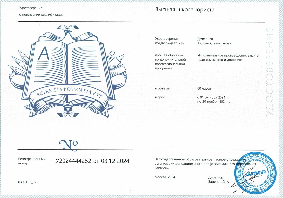 Преимущества: Если вам необходима юридическая помощь грамотного и успешного юриста, обращайтесь к Андрею Дмитриеву. Еще раз спасибо!!!